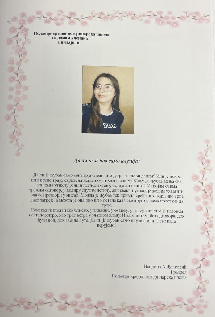 Овај фестивал ми је помогао да стекнем више самопоуздања, да верујем у своје писање и да схватим колико речи могу да повежу људе. Научила сам да љубав у поезији може имати много облика и да свако од нас има свој начин да је изрази. Поносна сам што сам била део овог догађаја и што сам имала прилику да представим своје стихове. Ово искуство ћу дуго памтити као један леп корак у свом креативном и личном развоју.